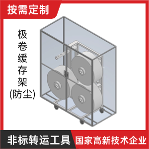 (防尘)是锂电电芯生产车间中的关键设备,主要用于保护极卷免受损伤并调节生产节奏。它通过分层设计和防滑限位装置,为极卷提供稳定的存放空间,避免堆叠挤压导致的极片褶皱或边缘损伤,从源头减少不良品。同时,它还能作为“效率调节器”,在卷绕、裁切、叠片等工序节奏不同时,通过缓存极卷快速补位,避免前道工序停机待料或后道工序空转,提升整体生产效率。
